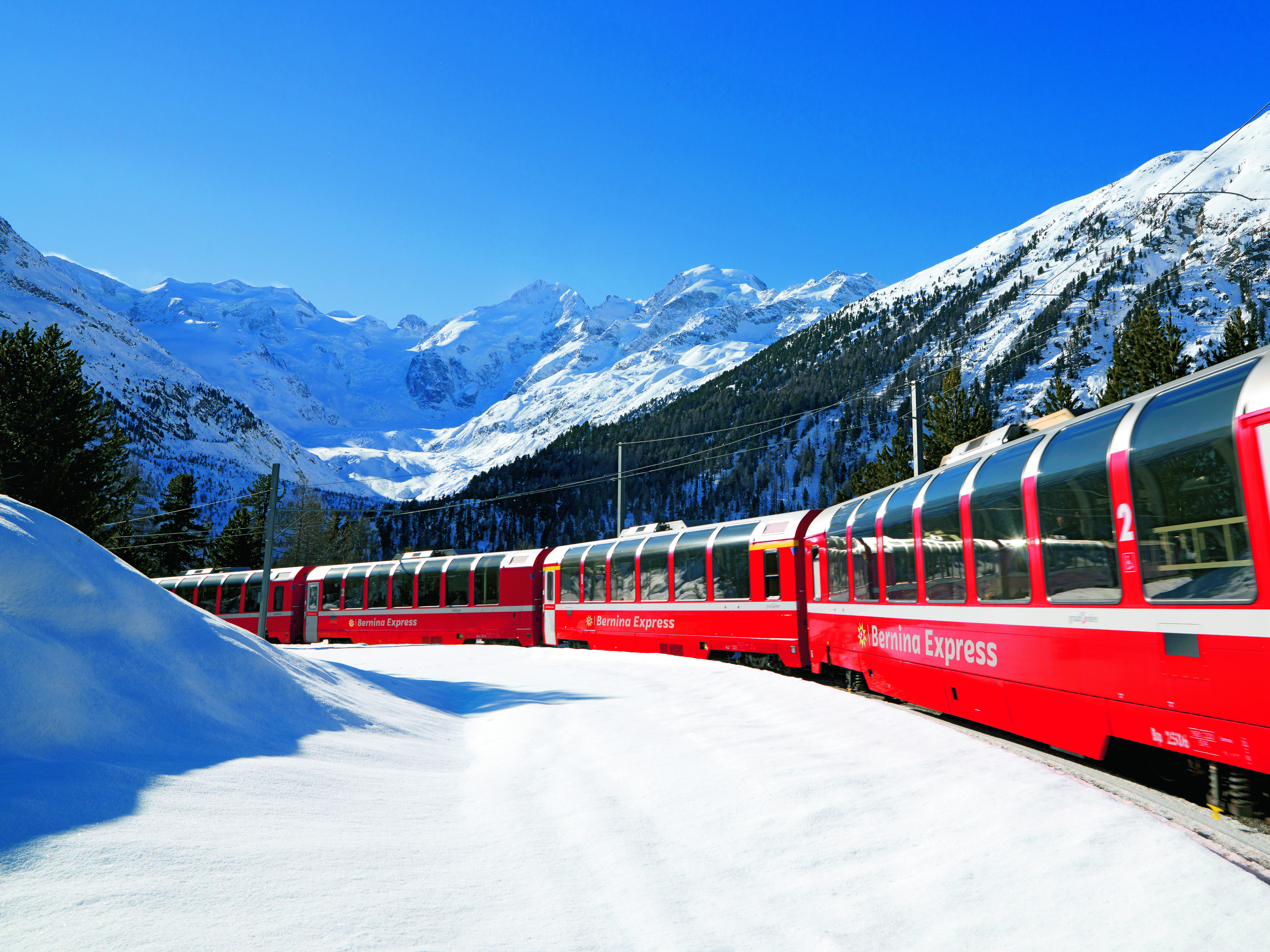 wenn Sie mit der bekannten Bernina Bahn auf den höchsten Bahngleisen Europas und den steilsten der Welt an spektakulären